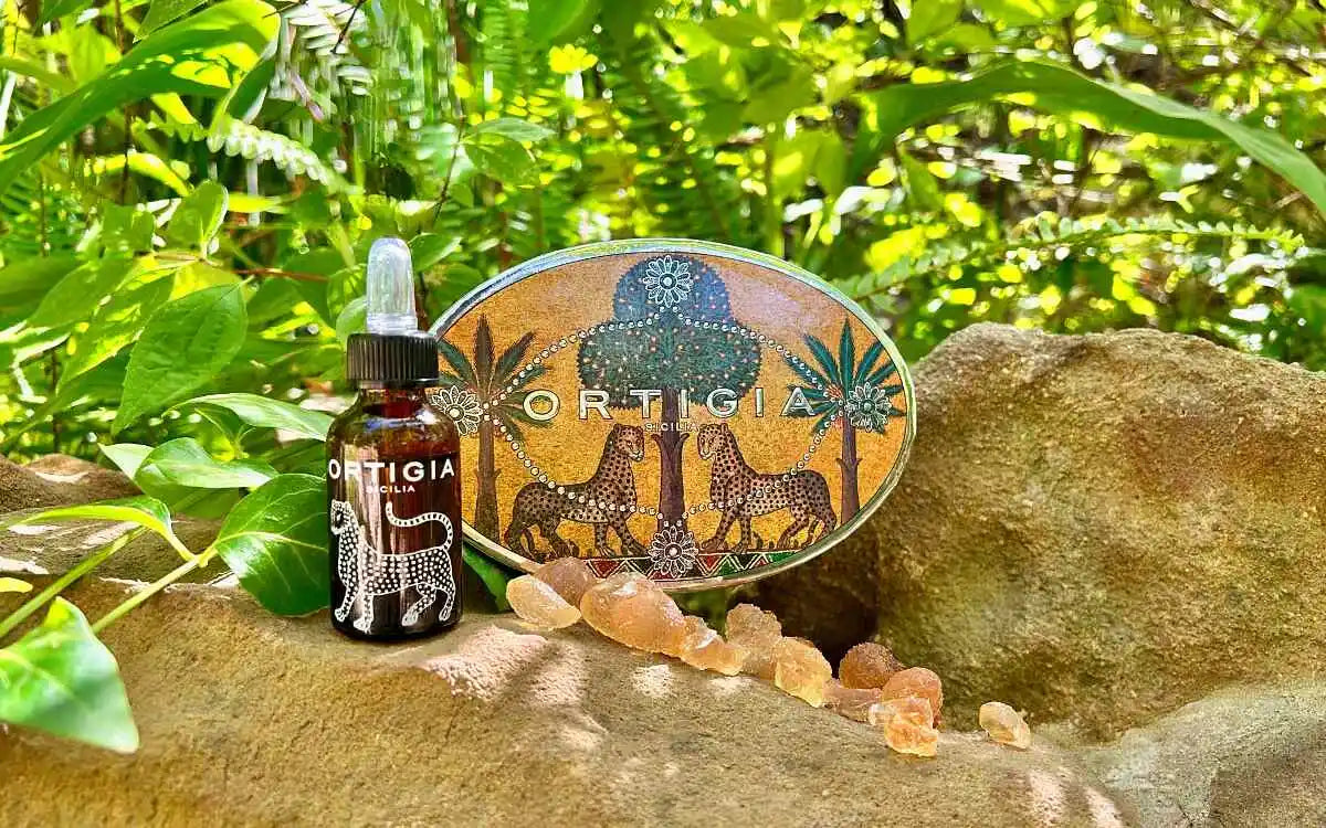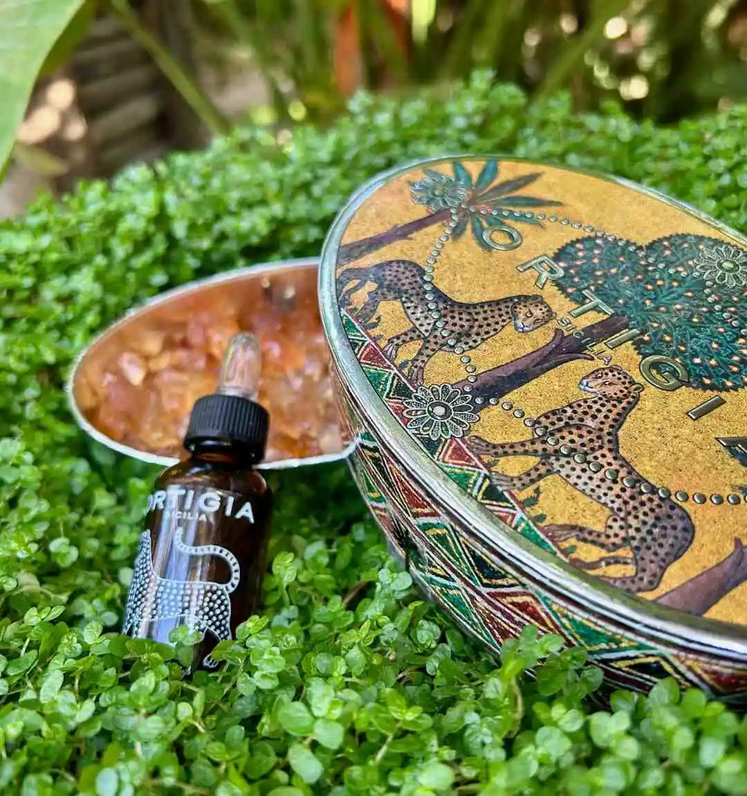 Glittrande doftkristaller av naturlig gummi från akacia, generöst berikade med Ortigias parfym Ambra Nera. Kristallerna sprider en varm och fyllig doft av amber och mysk, elegant balanserad med kryddiga tränoter.